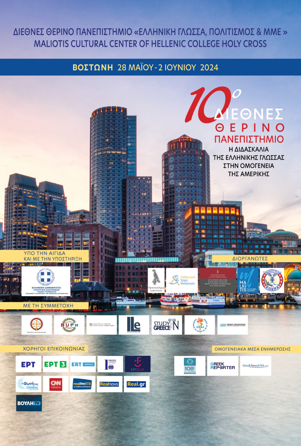 «Εθνική προσπάθεια η οποία θα έχει και συνέχεια» χαρακτηρίστηκε η δέκατη, επετειακή διοργάνωση του Διεθνούς Θερινού Πανεπιστημίου «Ελληνική Γλώσσα, Πολιτισμός και ΜΜΕ» που πραγματοποιήθηκε με μεγάλη επιτυχία στη Βοστώνη και συγκεκριμένα στο Maliotis Cultural Center του Hellenic College Holy Cross με θέμα τη διδασκαλία και τη διάδοση της ελληνικής γλώσσας στην ομογένεια των ΗΠΑ. Το πρόγραμμα κατάφερε μία δυναμική παρέμβαση στο πεδίο της προσέλκυσης και της αναζωογόνησης του ενδιαφέροντος για τη διδασκαλία και διάδοση της ελληνικής γλώσσας στην ομογένεια. Το παρακολούθησαν 200 περίπου εκπαιδευτικοί, καλλιτέχνες και δημοσιογράφοι με φυσική παρουσία και περισσότεροι από 1500 διαδικτυακά. Πανεπιστημιακοί και ερευνητές από 25 Πανεπιστήμια και ερευνητικά κέντρα του εξωτερικού, από χώρες όπως τα Ηνωμένα Αραβικά Εμιράτα και το Μάλι της βορειοδυτικής Αφρικής, τη Σερβία, τη Βραζιλία, και φυσικά από πολλές ευρωπαϊκές χώρες και πολιτείες των ΗΠΑ. Το πρόγραμμα οργανώθηκε από το Εργαστήριο Μελέτης Κοινωνικών Θεμάτων, ΜΜΕ και Εκπαίδευσης του Παιδαγωγικού Τμήματος Νηπιαγωγών της Σχολής Επιστημών Αγωγής του Πανεπιστημίου Ιωαννίνων σε συνεργασία με το Μαλιώτειο Πολιτιστικό Κέντρο και την ΑΧΕΠΑ, υπό την αιγίδα και με τη στήριξη της Γενικής Γραμματείας Απόδημου Ελληνισμού και Δημόσιας Διπλωματίας του Υπουργείου Εξωτερικών της Ελλάδας, με τη συμμετοχή των Τμημάτων Ελληνικής Παιδείας του Οικουμενικού Πατριαρχείου και της Ελληνορθόδοξης Αρχιεπισκοπής Αμερικής, των Boston University Philhellenes, του University of Chicago – Center for Hellenic Studies, του Setor de Grego, Instituto de Letras, του Rio De Janeiro University, της Study in Greece και της Εθνικής Πινακοθήκης – Μουσείο Αλέξανδρου Σούτσου.