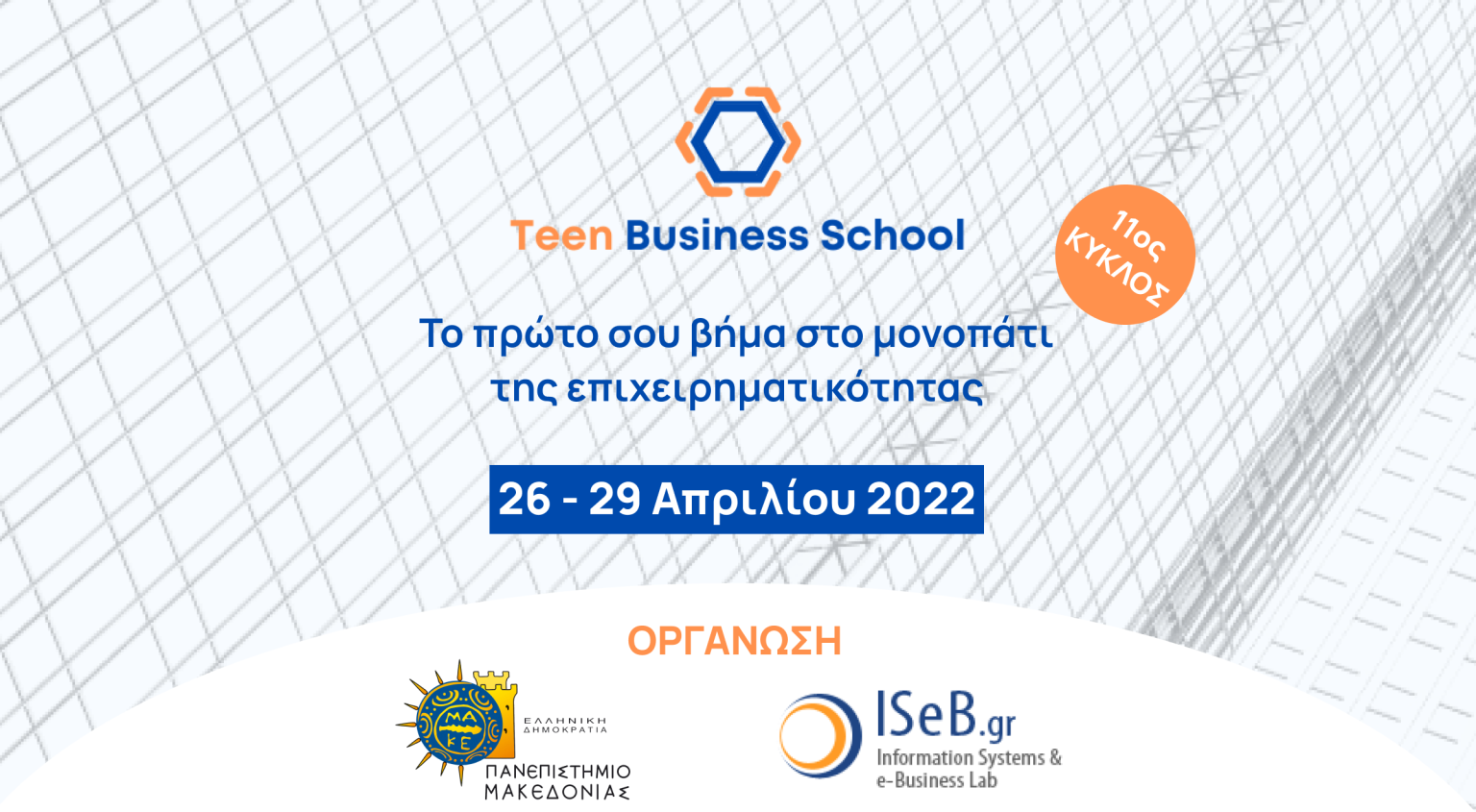 Ο 11ος κύκλος του Teen Business School θα πραγματοποιηθεί εξ’ αποστάσεως από την Τρίτη 26 έως την Παρασκευή 29 Απριλίου 2022. Για 4 ημέρες, μαθητές και μαθήτριες από όλη την Ελλάδα θα έχουν την ευκαιρία να αξιοποιήσουν δημιουργικά μέρος των πασχαλινών τους διακοπών και να έρθουν σε επαφή με τον κόσμο της επιχειρηματικότητας. Θα έχουν την δυνατότητα να γνωρίσουν καλύτερα τον εαυτό τους και να εμπνευστούν για την χάραξη της δικής τους επαγγελματικής πορείας.