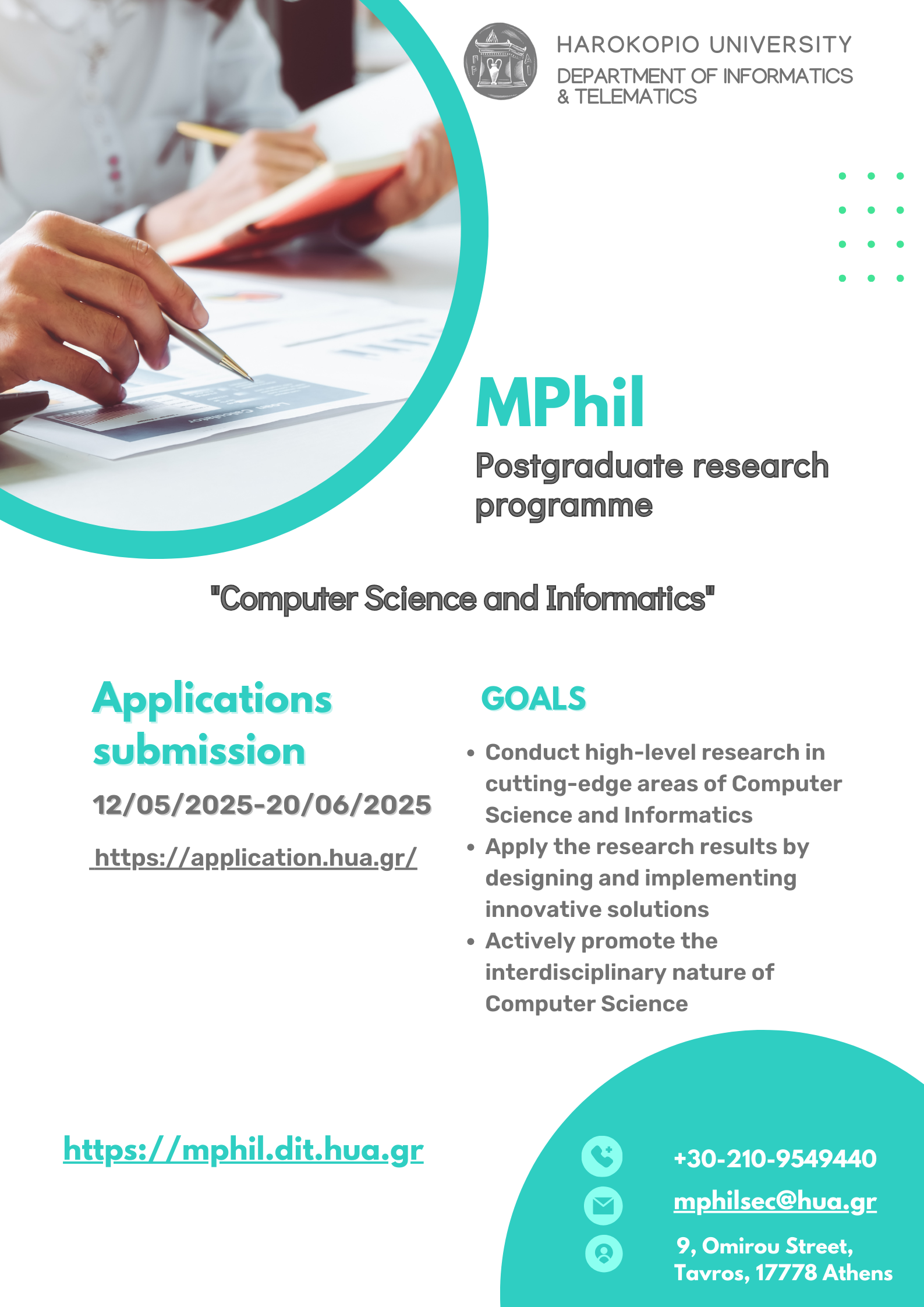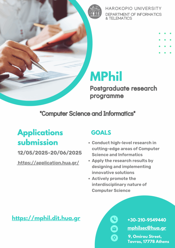 The Department of Informatics and Telematics, according to the Decision no. 198/08.05.2025 of the Assembly of the School οf Digital Technology invites applications from prospective postgraduate students to the Postgraduate Program (MPhil) leading to a Research-Oriented Master’s Degree in “Computer Science and Informatics” for the academic year 2025–2026.